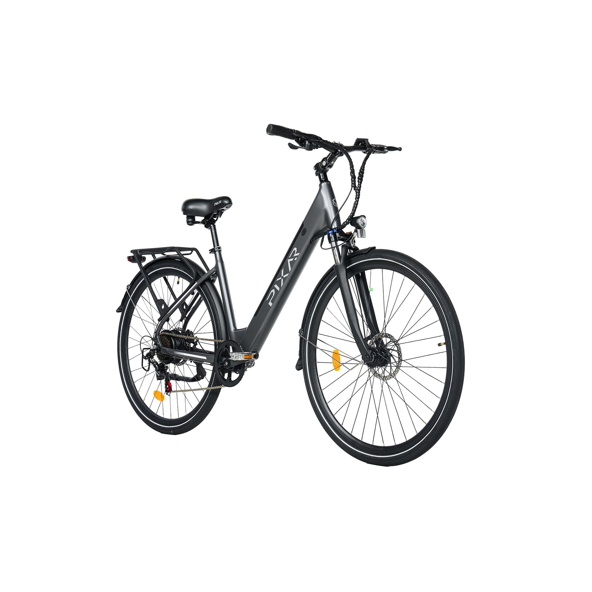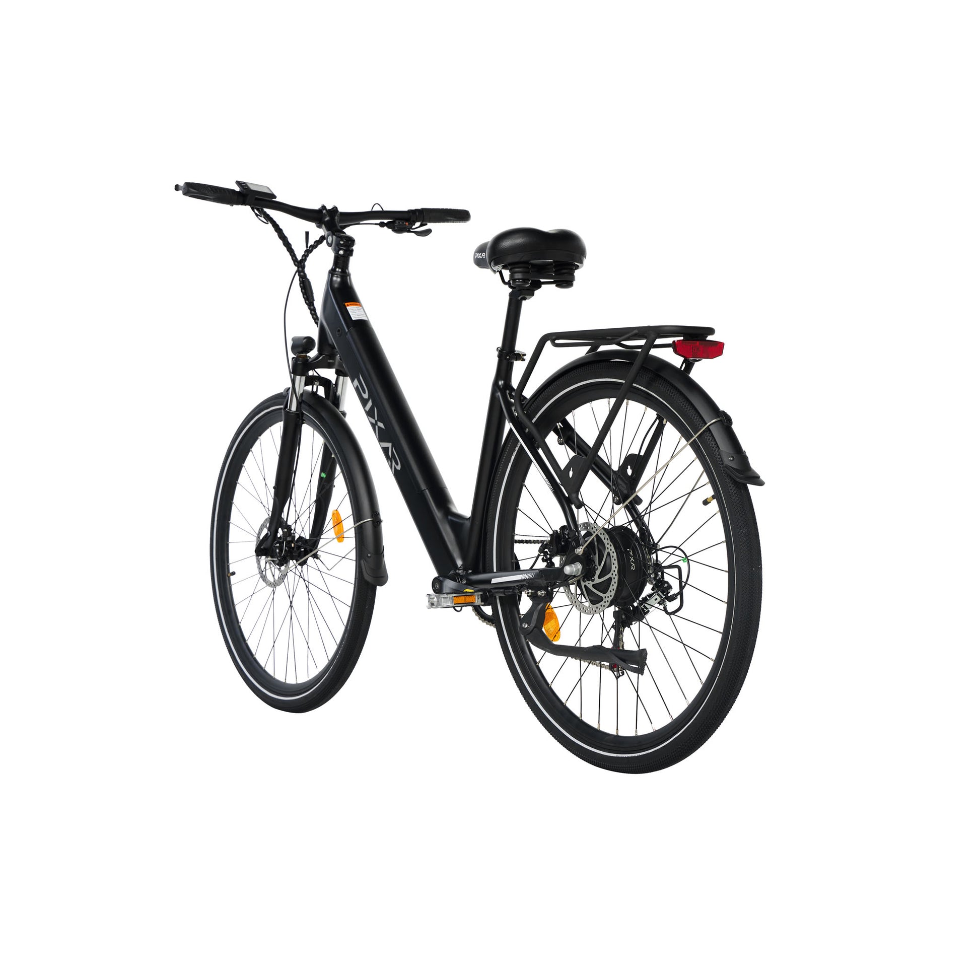 The PIXAR® City1 offers a perfect mix of efficiency, comfort, and style in a lightweight design. Featuring an aluminium alloy frame paired with a 36V 250W brushless hub motor (JIABO) and a 36V 10.4Ah lithium battery (EVE cells), it delivers dependable performance on fitness rides, paved roads, and light gravel. Its front suspension fork with lockout, Shimano 7-speed gearing, and 700C × 40 mm tires ensure smooth and stable handling. Mechanical disc brakes provide reliable stopping power, complemented by front and rear LED lights and PVC fenders for all-weather readiness. The left-mounted display keeps you informed of speed, pedal-assist level, and battery life. Switch effortlessly between electric, pedal-assist, or pedal-only modes to suit your ride. With a pedal-assist range up to 60 km (37 mi) and throttle-only range of 30 km (19 mi), the City1 reaches a top speed of 25 km/h (15.5 mph), unlockable to 32 km/h (20 mph) for added versatility.