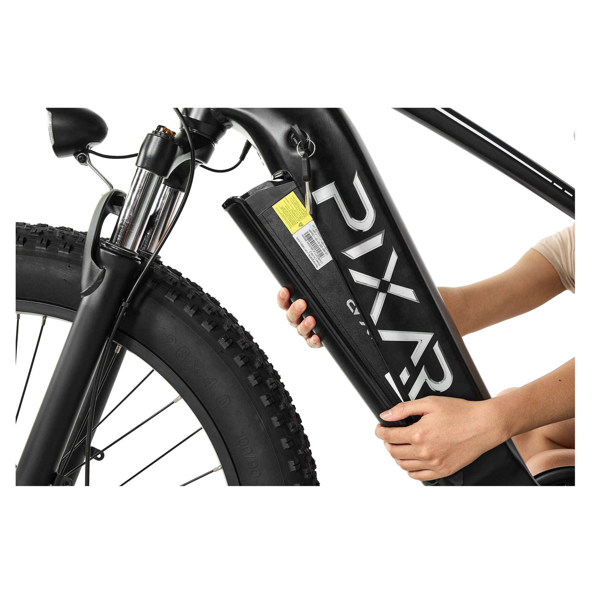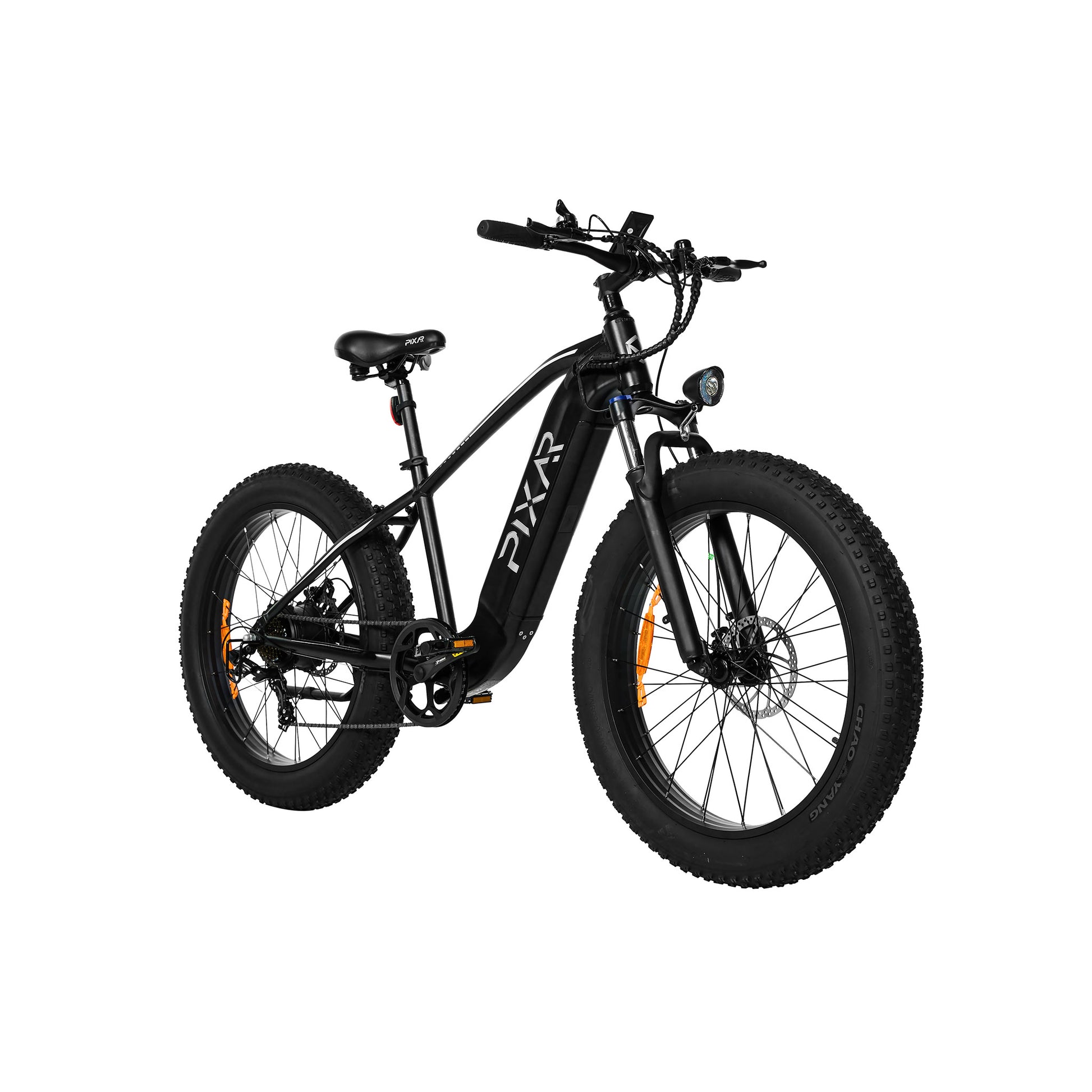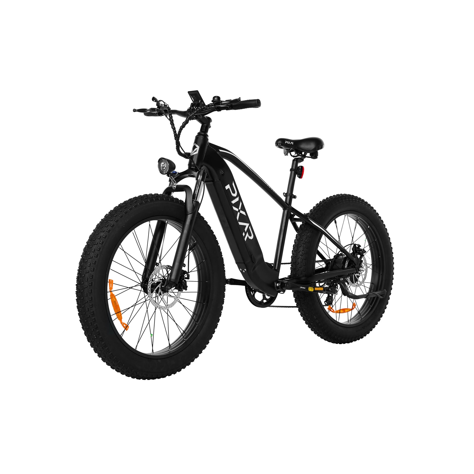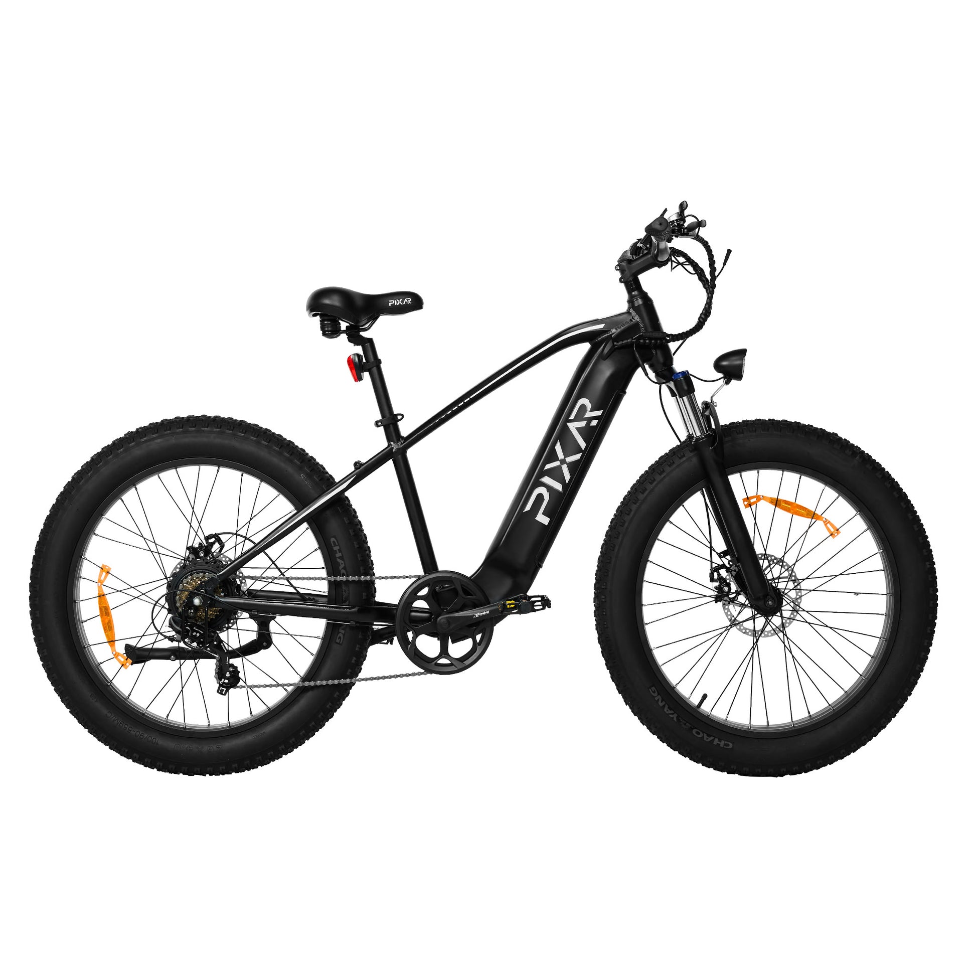 The PIXAR® Space1 is built for riders seeking power, endurance, and stability with its rugged fat-tyre design. Powered by a 48V 500W JIABO brushless hub motor and a 48V 20Ah EVE lithium battery, it offers an impressive pedal assist range of up to 120 km (75 miles) or 60 km (37 miles) on throttle alone. Its large 26” × 4.0” Chaoyang fat tyres deliver exceptional grip across sand, snow, dirt, and rough terrain, while the 6061 aluminium frame combines strength with lightweight durability. Featuring a Shimano 7-speed system, Filair mechanical disc brakes, a suspension fork with lockout, and a colour LCD display with USB Type-C port, this e-bike offers precise control and convenience. Additional highlights like front and rear lights, PVC fenders, a steel rear rack with basket mounts, and a comfortable saddle make the Space1 perfect for long rides where performance and reliability matter.
